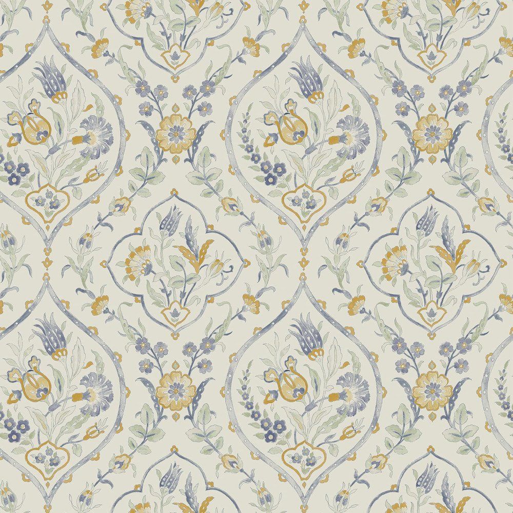 Soft and inviting, this abstract damask print features marigold and tulip-like flowers in a watercolour style.