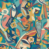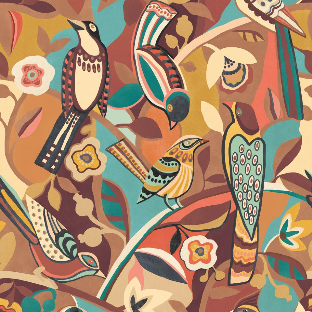 An expressive wallcovering featuring stylised birds, graphic florals, and bold colour blocking. This design merges traditional folk motifs with contemporary energy, creating an unforgettable statement piece. Perfect for adding depth and charm to any space.