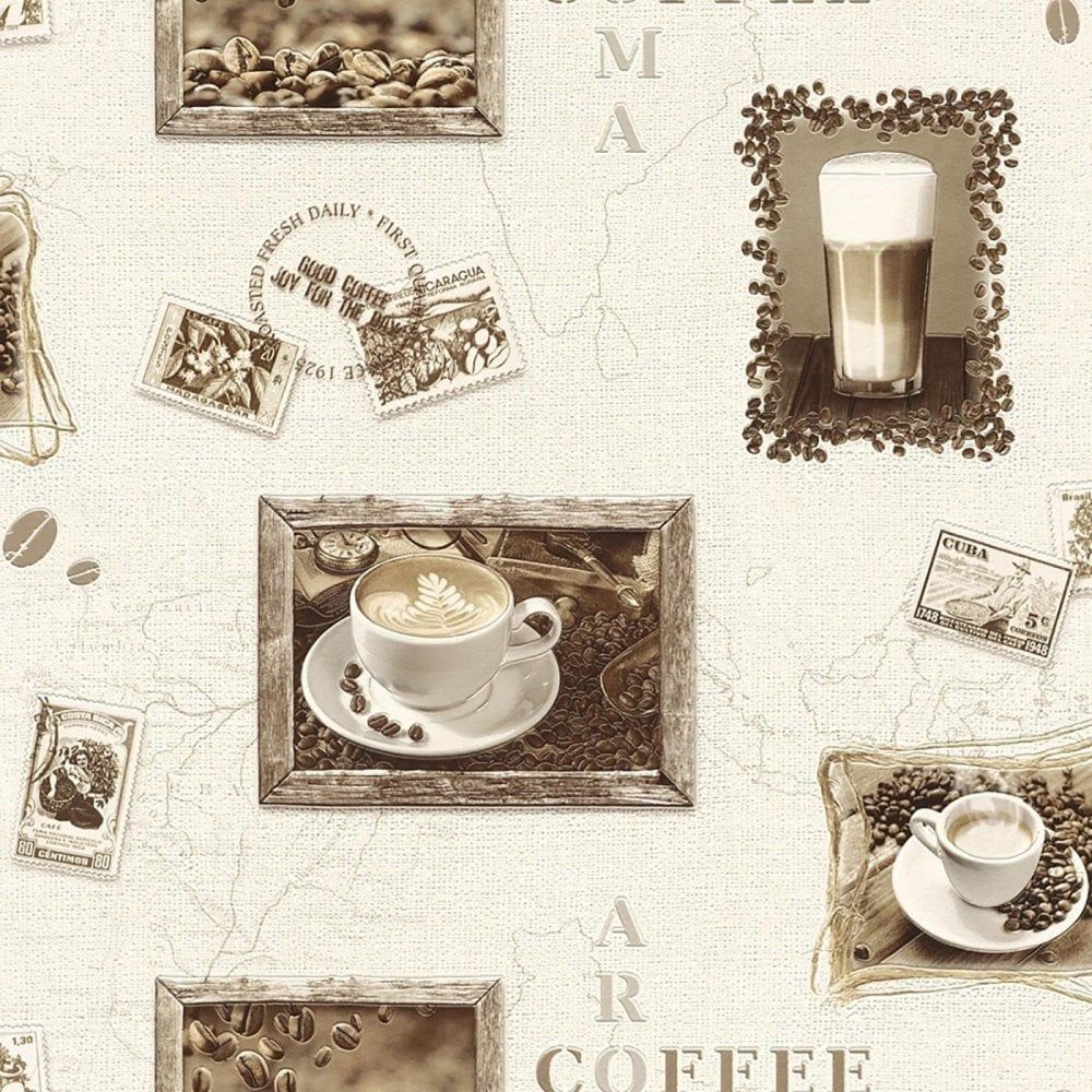 New from Rasch, this Coffee Shop inspired wallpaper is a sure way to add a warm and cosy feel to your walls. Features lovely motifs of coffee and stamps from South America in varying beige and cream tones throughout, set on a textured luxury vinyl for a truly mesmerising wallpaper. This wallpaper is perfect for use on a large wall area and makes a fabulous feature wall.